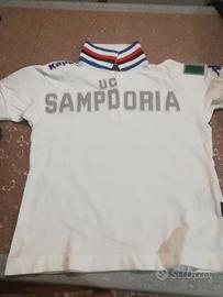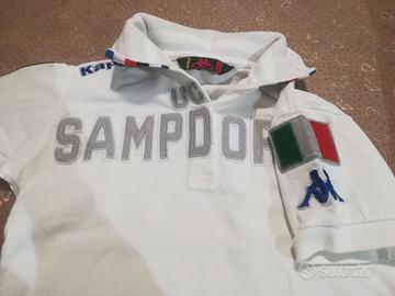 Polo Bambino Sampdoria, marca Kappa, cotone 10%, Taglia 8 anni, dimensioni 50 cm di lunghezza, 40 cm tra le ascelle. Colore Bianco. Manica corta.