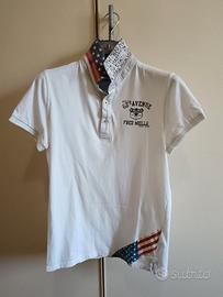 Polo bianca a maniche corte Fred Mello, taglia 10-11 anni (lunghezza da spalla a vita 61cm). 100% cotone. Colletto con decorazioni sul rivolto. Indossata un paio di volte, in condizioni perfette