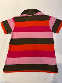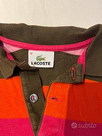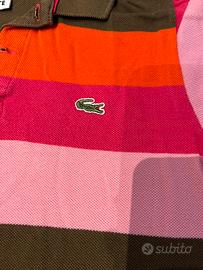 Maglietta polo Lacoste a righe multicolor per bambino. - Modello a righe orizzontali - Colori: rosa, rosso, marrone - Maniche corte - Chiusura con bottoni - taglia 10 anni