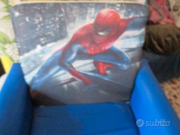 Poltroncina con l'immagine dell'Uomo Ragno sullo schienale, è imbottita e di colore azzurro, è per bimbi di 1-3 anni. Disponibili, per inutilizzo, altri giochi: 1 biliardino/calcio balilla da tavolo, 1 Tappeto Attività di Peppa Pig, 1 moto per bimbe, 1 scudo di Capitan America, 1 maschera di supereroe, alcuni Gormiti, alcuni giochi in scatola, alcune macchinine e camion, 3 monopattini, pupazzi di peluche e bambole di stoffa grandi e piccole; prodotti per l'infanzia tra cui 1 culla Pali Cuccioli, 1 passeggino leggero Inglesina, 1 vasino Chicco; abbigliamento: giubbini, smanicati, montgomery, jeans, alcune tute, bermuda, alcune paia di scarpe estive e invernali, t-shirt in cotone a maniche lunghe e corte, alcune felpe.