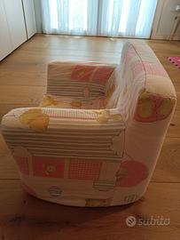Poltroncina morbida in gommapiuma rivestita da copripoltrona lavabile con fantasia sul rosa, grigio e bianco. Altezza seduta 17 cm.