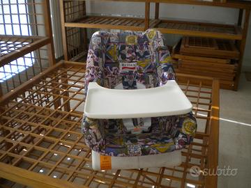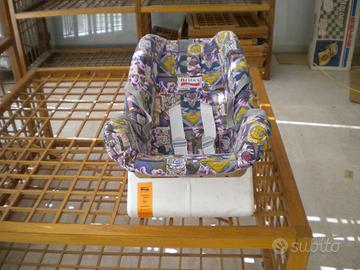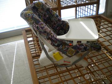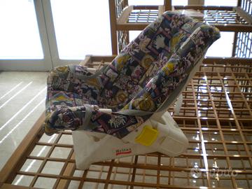 Poltroncina relax reclinabile nuova per neonati e bimbi (0-12 mesi), con cintura per assicurare il bambino e con cinghie per il trasporto a mano, con struttura e tavolino rimovibile (per appoggiare giochi ed altro) in plastica lavabile di colore bianco, con imbottitura in tessuto, sfoderabile e lavabile.
