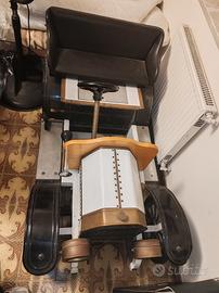 Motore a scoppio 2 tempi, cambio con marcia avanti e retromarcia, frizione automatica, luci funzionanti, gomme da sostituire, freno a mano, panca regolabile, carrozzeria in lamiera, finiture in ottone.