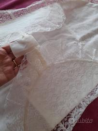 Articolo di biancheria d'epoca utilizzato per avvolgere i neonati, spesso in occasioni speciali come il battesimo. Vintage, realizzato in cotone bianco e rifinito con pizzi e merletti. Utilizzato per coprire il cuscino su cui viene adagiato il bambino durante la cerimonia del battesimo. Realizzato in puro cotone con dettagli in pizzo. Articolo d'epoca, risalente agli anni '60, anche da collezione. Perfetto, presenta solo un piccolo segno più scuro dove è stato piegato.