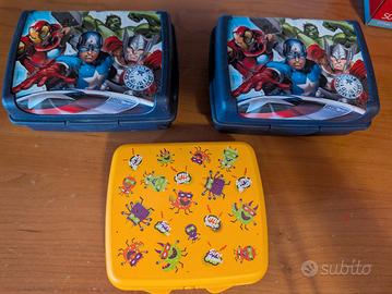 Due porta merenda dei supereroi e un porta merenda Tupperware, ideali da portare a scuola o in gita
