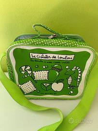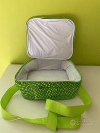 Vendo porta merenda termico, con doppia cerniera, e tracolla. Dimensioni 21x8x7 cm