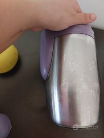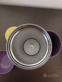 Contenitore termico con due barattolini per trasportare la pappa. Il coperchio viola si può usare come piattino e la maniglia può contenere un cucchiaino. Davvero comodo!