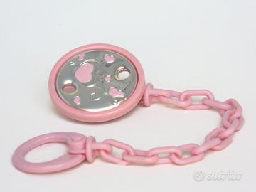 La catena in plastica rosa, realizzata con materiali anallergici di alta qualità, si abbina perfettamente al grazioso ciondolo argentato decorato con delicati cuoricini. Il design funzionale include una clip robusta che si aggancia facilmente ai vestiti del bebè, mentre il meccanismo di apertura del ciondolo consente di inserire e rimuovere il ciuccio con semplicità.
