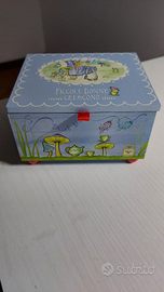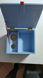 Un pratico portagioie per bambina in legno colorato. Con scomparti. Dimensioni: 14 x 12 cm altezza 8 cm.