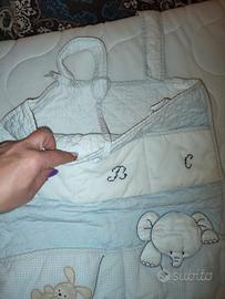 borsa portapigiami con tasca grande e comode taschine sul davanti. con i suoi comodi lacci si può appendere alla sponda del lettino ideale per conservare pigiama, zanzariera o copertina per il riposino. puro cotone trapuntato e ricamato. molto bella!