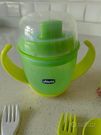 Kit composto da 3 forchettine 3 cucchiaini 1 bicchiere con manici e beccuccio 1 bicchiere con cannuccia