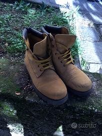 Robusti scarponcini alti in pelle nabuk color senape con rinforzi in pelle marrone, suola a carrarmato, foderati, comodissimi, no gender, portati pochissimo,in ottime condizioni con unico difetto: segni sulla parte anteriore(vedi ultima foto)