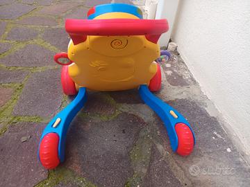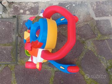 Primi passi Chicco dotato di maniglione ergonomico che aiuta il bambino a sostenersi e muovere i primi passi in sicurezza. La struttura è stabile e robusta, con ruote larghe che garantiscono un buon equilibrio durante l’utilizzo. Dotato di effetti luminosi e sonori nella parte superiore (funzionanti) e di un pannello attività multifunzione con giochi manuali e sensoriali: forme da incastrare, rulli colorati, elementi girevoli e parti mobili pensate per stimolare la coordinazione, la motricità fine e la curiosità. Adatto indicativamente a bambini dai 9–12 mesi in su. Il gioco é in buone condizioni, completo e funzionante (richiede 2 pile AA,giá incluse). Regalo un sacchetto pieno di palline colorate che si possono usare per questo gioco o per altro