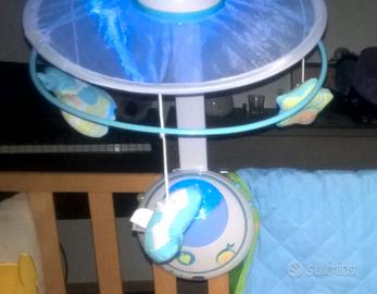 Bellissimo carillon Chicco con Musica e Proiettore con luce soffusa, installabile rapidamente e in sicurezza sulla maggior parte dei lettini. Lucina per la notte. Telecomando per cambiare modalità o spegnerlo a distanza, molto comodo. Includo pupazzo orsacchiotto molto morbido e carillon manuale a forma di luna. Come nuovo. Batterie non comprese.