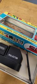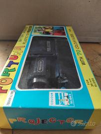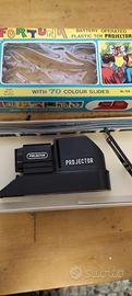 giocattolo anni 60 ....cinepresa in plastica con diapositive proiettabili ..gioco vintage a batteria ancora imballato con scatola originale e prezzo di mille lire..vetrina negozio modernariato vintage casa locale hobby...giochi d epoca proiettore