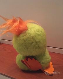 Vintage anni 80, tenuto riposto in un baule quindi mai utilizzato, peluche morbido, becco e zampe in tessuto, internamente le zampe di tessuto hanno una struttura in acciaio o ferro che consentono al pulcino di stare in piedi.