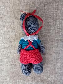 Bellissimo orsetto amigurumi (giocattoli lavorati all'uncinetto) realizzato a mano con filato di qualità. Dimensione circa 17 cm (misurato con metro a fianco). Vestito con maglioncino azzurro e pantaloncini rosa con bretelle, dettagli curati e simpatici. Perfetto come regalo per bambini, decorazione da collezione o complemento per camerette e hobby artigianali. Pezzo unico e fatto con amore.