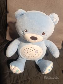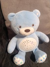 Questo è il proiettore peluche Chicco Baby Bear della linea First Dreams, un orsacchiotto morbido che riproduce melodie rilassanti e crea un'atmosfera magica con proiezioni di luce sul pancino.
