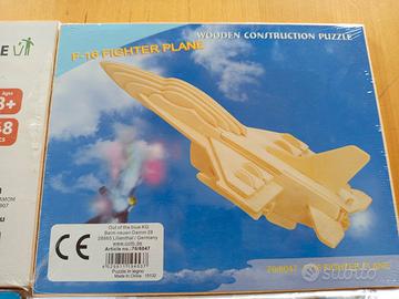 Tre puzzle 3D, ancora confezionati, nuovi, aggiungo lavagnetta con pennarello cancellabile pure lei nuova. I soggetti sono Shuttle, aereo, cavalletta. C'è scritto dai 3 anni in su ma io aggiungeri meglio dai 4-5 anni. In legno compensato. Marchio CE.