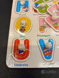 Puzzle educativo in legno progettato per aiutare i bambini a imparare l’alfabeto. Ogni lettera dell’alfabeto è rappresentata da un tassello rimovibile con una manopola per facilitare la presa. Sotto ogni lettera c’è un’immagine e una parola associata che inizia con quella lettera (es. “A” per “Apple”, “B” per “Car”, “C” per “Duck”, ecc.). Le lettere sono colorate e presentano piccoli disegni per attirare l’attenzione dei bambini e rendere l’apprendimento divertente e interattivo. Scopo educativo: •Insegnare l’alfabeto •Stimolare la coordinazione occhio-mano •Favorire l’associazione tra lettere e parole •Sviluppare il linguaggio e il vocabolario inglese #montessori #montessoriactivity #montessoriattività #attivitàmontessori #bambini3anni #bambini2anni #bambini4anni #giocointelettuale #montessoritoddlers #toddlers #bambini #scuola #asilo #materialiperinsegnanti #stem #montessoriacasa #homescooling. #preschooling #giocodidattico #vocabolario #giochiintelettuali #scuolamontessori #montessorischool #giocoeducativoperbambino #giocoeducativoperbambini #idearegalo #regalobambini #regaloperbambini #materialimontessori #legnomontessori #materialemontessori #giochiinteressanti #interestingtoys #interestinggames #legnomontessori #montessoriwood #woodtoys #giocattoliinlegno#giochiinlegno #legno #forme #formemontessori #pedagogiamontessori #homeschooling#giocointerattivo #montessorischool #giocoeducativo #giocodidattico #woodentoys #developmenttoys
