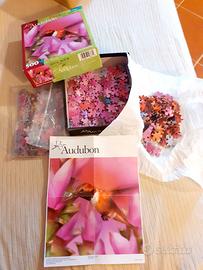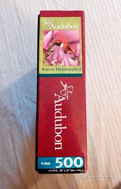 Puzzle marca Buffalo Games in collaborazione con la società naturalistica Audubon, raffigurante un colibrì arancione (descrizione in inglese dell'animale sul lato della scatola).
