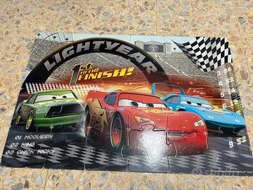 Puzzle del film Cars, 1st to the Finish. - Personaggi: Saetta McQueen, King e Chick Hicks. - Scena di gara con bandiera a scacchi.