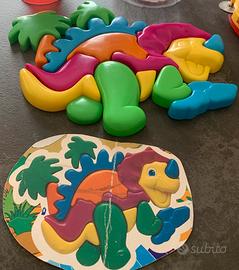 Vendo divertenti giochi per bambini! Il set include un colorato puzzle a forma di dinosauro, un tamburello vivace e un simpatico clacson rosso per bicicletta. I giochi sono in ottime condizioni, perfetti per ore di divertimento. - Puzzle dinosauro colorato e facile da assemblare con contenitore con coperchio per riporlo e immagine su come assemblarlo.
