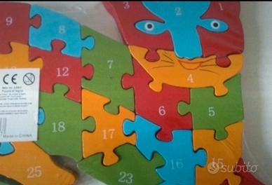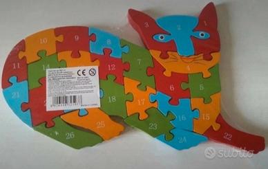 Puzzle didattico con numeri e lettere a figura di gatto. In legno.