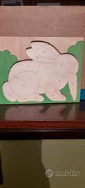 Puzzle interamente in legno raffigurante coniglietto con carota piccolo segno di pennarello su un pezzo come da foto.
