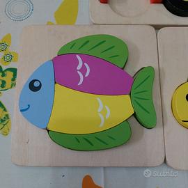 Puzzle in legno per bambini da 1 anno in su, con animale tartaruga e pesce. In regalo la locomotiva perché manca una ruota. Usati ma tenuti bene!