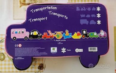 Puzzle 50 pezzi in cartone lucido rigido. Soggetto catena lunga 1,30 m di 9 mezzi di trasporto con la famiglia Barbapapa completa. Scatola sagomata a forma di pulmino rosa. Dai 3 anni in su.