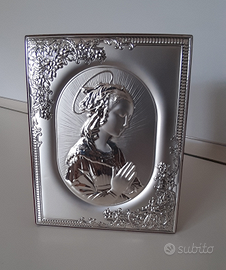 Quadretto in rilievo in argento Madonna in preghiera, retro in legno radica rossiccio, da appoggio o da appendere alla parete, con scatola/confezione originale, perfetto come regalo per battesimi,comunioni, cresime e ricorrenze varie, dimensioni 13 x 18 cm