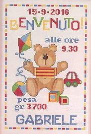 Ricamo per ricordare la nascita di un bimbo o di una bimba, realizzato a punto croce e personalizzato con tutti i dati del nuovo arrivato.