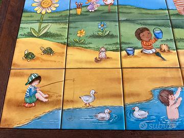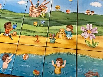 Meraviglioso quadro dipinto a mano su piastrelle ceramiche fatto da artigiano pittore romano, raffigurante varie scene di giochi di bimbi. Dimensioni 50x70. Cornice in legno grezzo. Oggetto unico, davvero una opera d’arte per la stanzetta dei bimbi. Diamo via per mancanza di spazio adatto. Consegna a mano o spedizione a rischio del compratore, vista la delicatezza delle piastrelle. Le condizioni sono perfette, esattamente come nuovo.