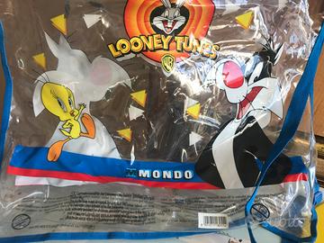 Sacca in plastica Looney Tunes con due racchette e una pallina . Usate una volta in giardino e un'altra volta sulla spiaggia.
