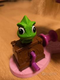 Bambola di Rapunzel seduta, con spazzola, alcuni fermagli ( ne mancano alcuni), girando la leva il camaleonte si muove e gira il rocchetto.
