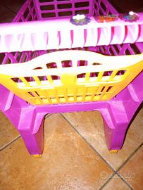 Dettagli del prodotto Carrello della spesa giocattolo, perfetto per i più piccoli. - Struttura in plastica resistente. - Colore rosa vivace con dettagli gialli. - Cestino e manico inclusi