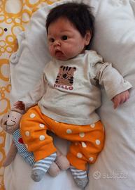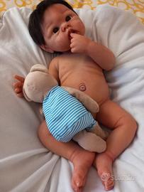 Bimbo rinato maschio interamente in silicone platino morbidissimo, di 48 cm e di 3.350 kg circa, dipinto con pigmenti siliconici strato su strato, con rossori, venature, graffietti, unghie e sfumature estremamente verosimili, sigillato con polvere opacizzante professionale siliconica, radicato con mohair premium di qualità castano, occhi di vetro solido, bocca aperta con gengive e lingua. Accetta il ciuccio vero ed una bottiglia con tettarella 0-3. Veste una taglia 0-1 mese. Può fare il bagnetto completo. Arriverà confezionato con cura con un tutto quel che serve per un'esperienza di role play completa: un corredino estivo ed uno invernale degno di questa meraviglia, con biancheria intima e pannolini di ricambio inclusi, i suoi ciucci con la loro scatolina, la catenella ferma-ciuccio, il suo pupazzetto e una bottiglia con tettarella sigillata e latte finto per simulazione allattamento, e borotalco e pennello con setole morbide per il suo mantenimento. Si consiglia di sistemare i capelli molto delicatamente con le mani o con spazzolino da denti con setole morbide o spazzola per neonati. Non strattonare gli arti. Maneggiare come se fosse un vero neonato. Sconsigliato per i bambini sotto i tre anni. Il prezzo è comprensivo del reborn e del suo ricco corredo (vedi ultime foto).