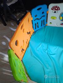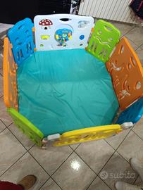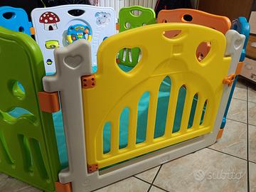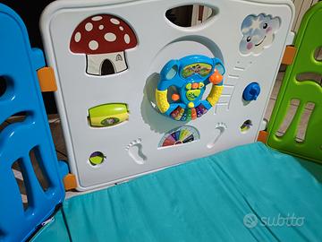 recinto per bambini in ottime condizioni, con porta di entrata e gioco tipo "volante" funzionante. possibilità di dargli la forma che più aggrada, 4 pannelli 40x60 e 4 pannelli 80x60. regalo tappetino con interno in gomma piuma fatto fare su misura (per forma ottagonale come in foto )sfoderabile e lavabile .