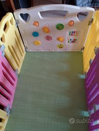 Recinto x bambini con apertura porta e giochi bimbo con tappetino numeri lettere usato pochissimo in zona Ostia 150x150x60 il recinto in foto è montato solo in parte i pezzi sono 14 porta e laterale + perni di ancoraggio si può sagomare a propia scelta anche tondo e adattare alla propia esigenza di spazio , finché è. visibile è disponibile per altre info potete contattarmi