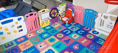 Recinzione colorata con porticina apribile e vari giochi integrati.
