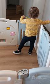 Recinzione per bambini, misure 110x160, pieghevole e forma personalizzabile, bianco e grigio. Formato da 14 pezzi di cui due di dimensioni maggiori, costituiti da un pannello con giochi e un cancello con chiusura. Piedini in gomma antiscivolo.
