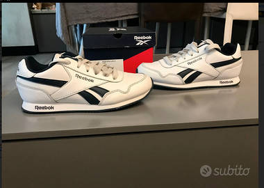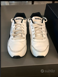 SUPERGLAM e COMODE SNEAKERS running/jogging classiche, realizzate in pelle bianca a contrasto profili blu. Articolo originale attuale collezione REEBOK KIDS. Calzano taglia 36. CONDIZIONI praticamente NUOVE adoperate per un paio di ore ad un matrimonio! Prezzo a RETAIL 69,99€