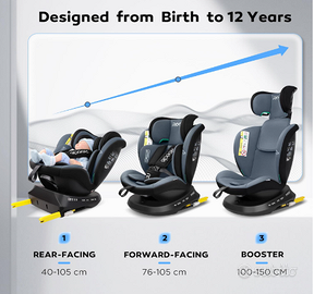 ➤ Conforme all'ultimo standard di sicurezza UN ECE R129 (I-Size). È un seggiolino auto multigruppo ed evolutivo adatto a bambini dalla nascita fino a 12 anni (circa 40-150 cm o 0-36 kg).