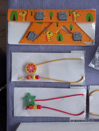 Tutto in legno, colorato, in imballi originari, tedeschi: 6 matite con sonagli e testa da giocoliere, 4 elastici per capelli con animaletti in legno, 1 set righello+2 squadrette, 3 segnalibri elastico+inserti in legno.