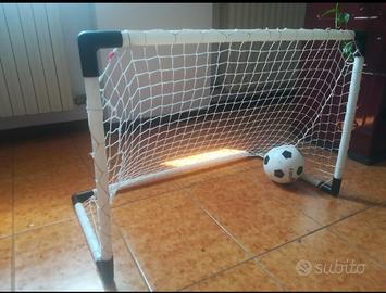 Set porta da calcio per bambini compresa di rete e pallone. Struttura di plastica resistente con rete in nylon con piccolo pallone per il momento sgonfio per motivi di spazio. Larghezza max 90 cm, altezza 61 cm e profondità 48 cm. Come da foto risulta smontata con evidenti segni di usura che non ne compromettono l' uso, nessun pezzo rotto solo strisciato.