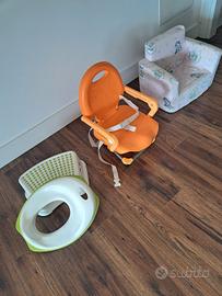 - Rialzo per sedia Chicco, regolabile a tre altezze con cinghie di ancoraggio e di sicurezza per bimbo.