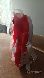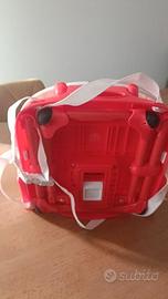 Rialzo sedia, con vassoio per la pappa. Dotato di cinture per legare il rialzino alla sedia, e per legare in sicurezza il bambino. Rialzo colore arancione e vassoio bianco.