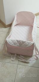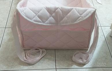 Riduttore di cotone trapuntato con stecche di legno inserite nei bordi adattabile per tutti i lettini con sponde, viene fissato con i lacci sulle sponde e appoggiato sul materasso del lettino, dotato di materassino proprio con fori traspiranti, made in Italy.