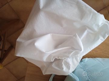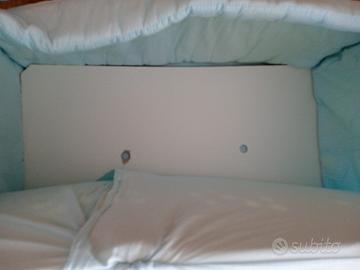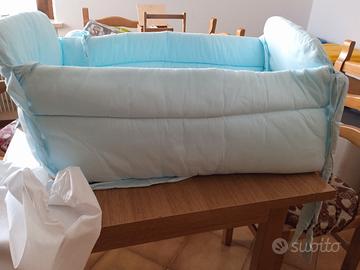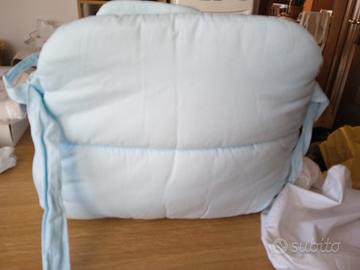 Riduttore per lettino colore azzurro con materassino anti soffoco in cotone e ben imbottito. ai quattro lati ci sono i lacci per fissare il riduttore al lettino. Unico difetto una piccolissima macchietta In regalo un coprimaterasso bianco